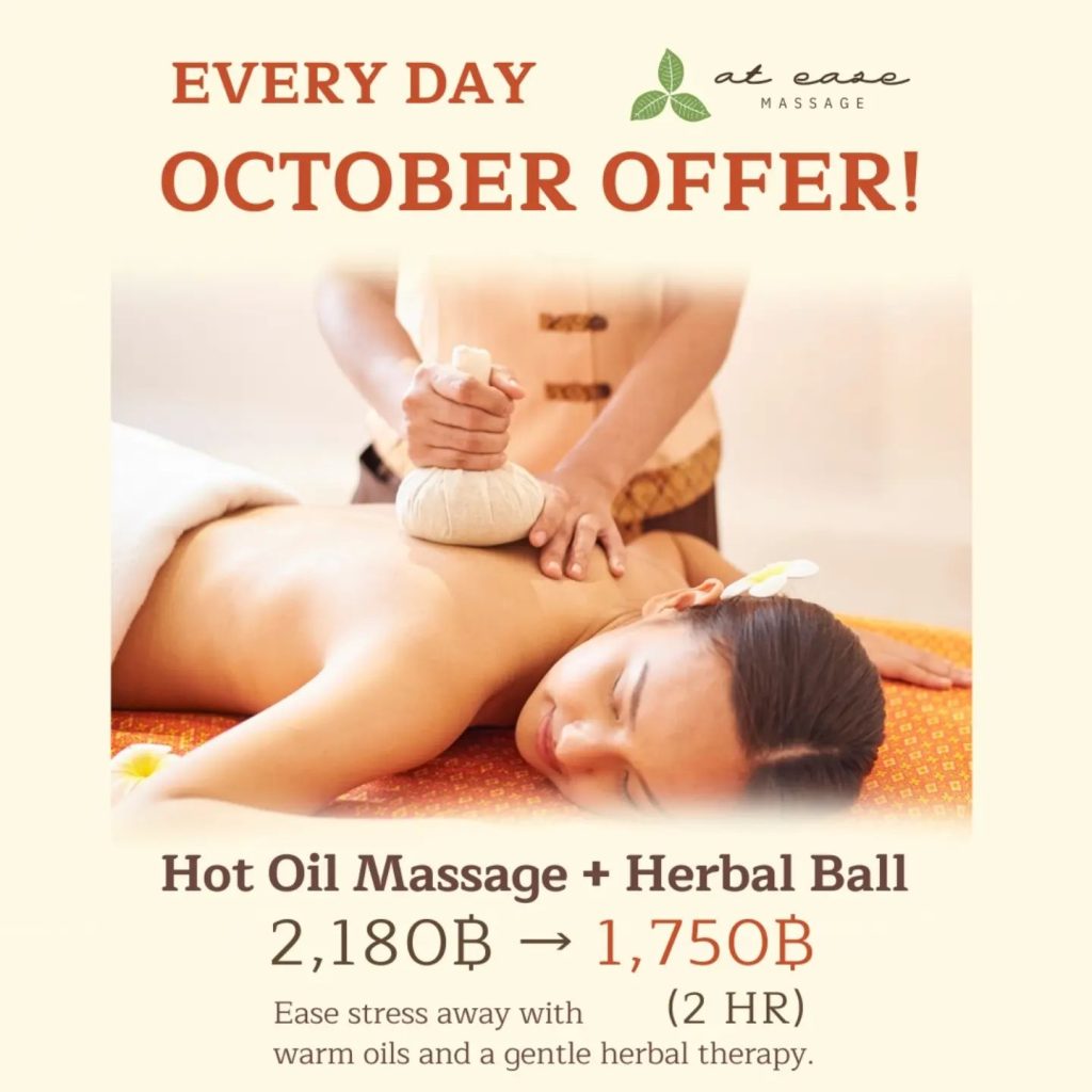 雨の日にぴったりな、2時間のホットアロマオイルマッサージとハーバルボールセラピーで心身ともにリフレッシュ!温かさとタイハーブの香りがあなたのお疲れを解きほぐします。20%OFFと大変お得になっておりますので、ぜひこの機会にご利用くださいませ!